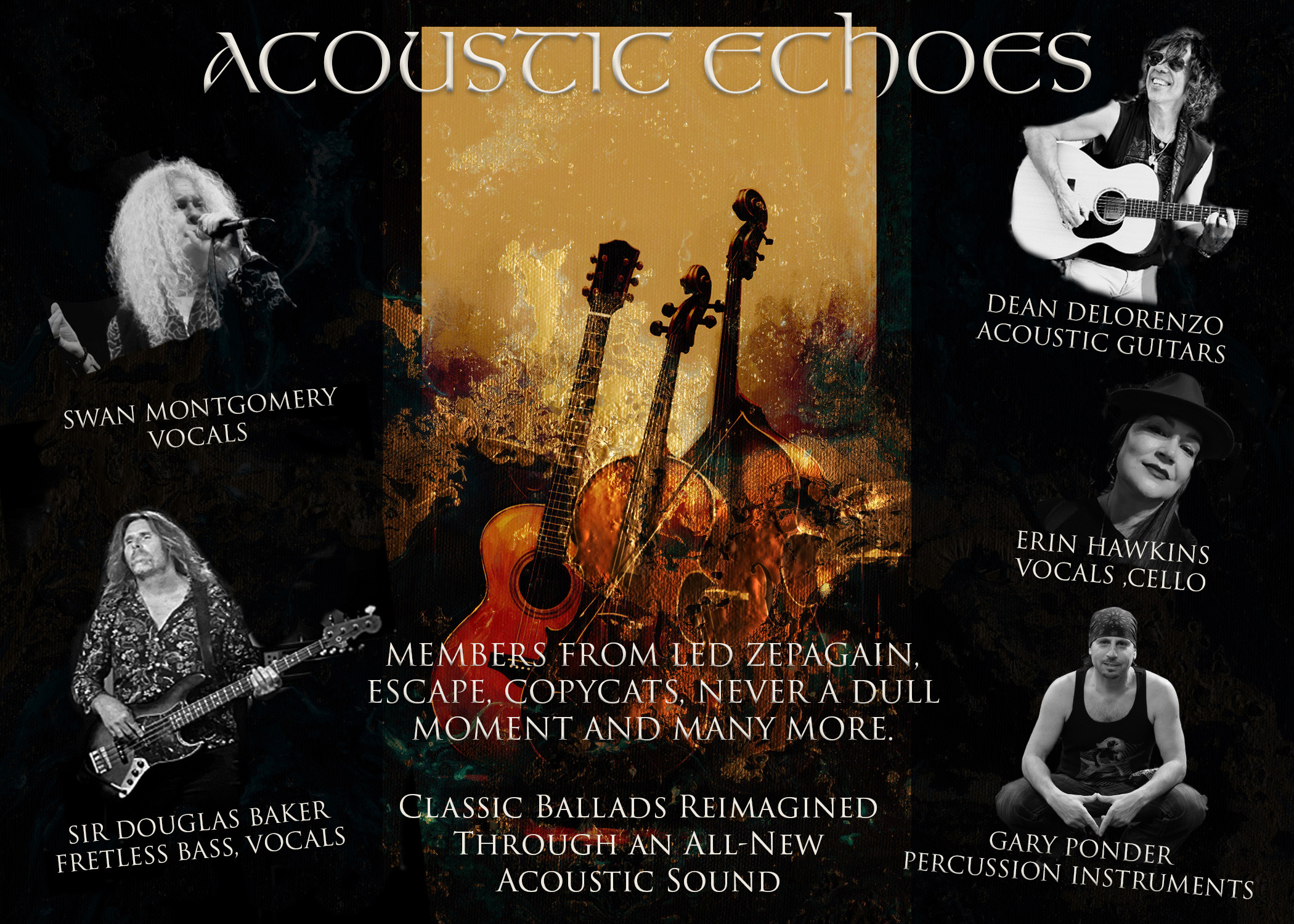 A powerful new live music experience featuring an incredible lineup of seasoned performers bringing classic ballads to life through an all-new acoustic sound. Featuring Lead singer from Led Zepagain Swan Montgomery on vocals, Dean DeLorenzo on acoustic guitars, Sir Douglas… Read more about: ACOUSTIC ECHOES